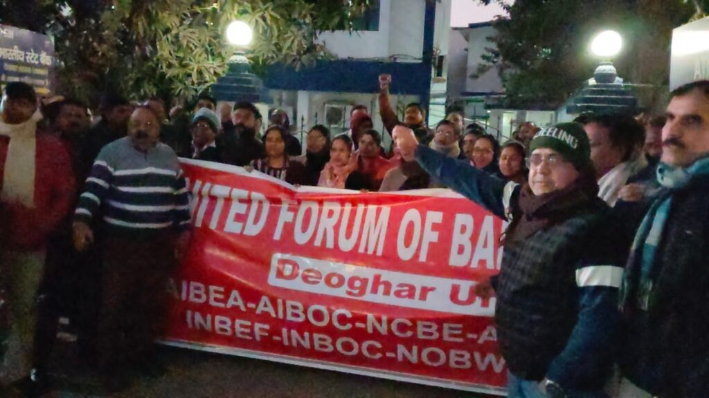 देवघर// भारतीय स्टेट बैंक, साधना भवन, देवघर यूनाइटेड फोरम ऑफ बैंक यूनियन्स (UFBU) के आह्वान पर 30 दिसंबर 2025 को देवघर स्थित भारतीय स्टेट बैंक, साधना भवन के समक्ष बैंक कर्मचारियों एवं अधिकारियों द्वारा पाँच दिवसीय बैंक कार्य सप्ताह लागू करने सहित अन्य लंबित एवं न्यायोचित मांगों के समर्थन में एक विरोध प्रदर्शन आयोजित किया गया। यह कार्यक्रम UFBU की देवघर इकाई के संयोजक एवं कर्मचारी संघ पटना मंडल के अध्यक्ष श्री मुन्ना कुमार झा की अध्यक्षता में सफलतापूर्वक संपन्न हुआ। कार्यक्रम में विभिन्न बैंकों के कर्मचारियों एवं अधिकारियों ने बड़ी संख्या में भाग लेकर अपनी एकजुटता का परिचय दिया।