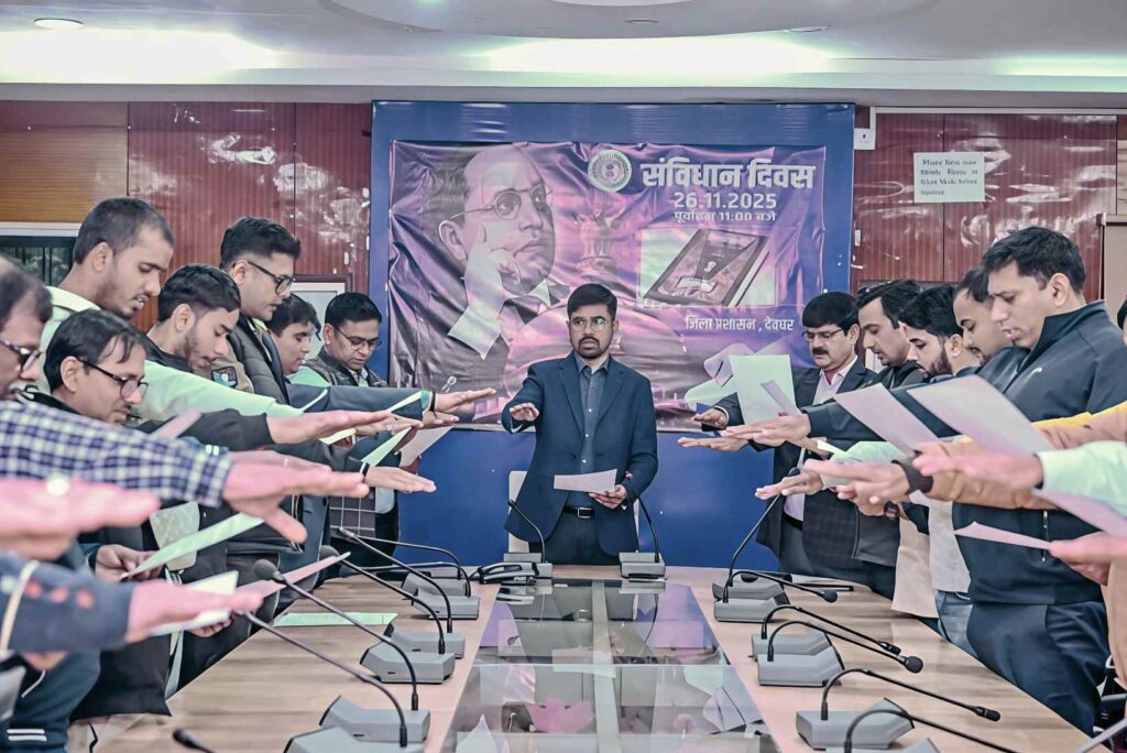 देवघर// उपायुक्त नमन प्रियेश लकड़ा द्वारा समाहरणालय सभागार में सभी पदाधिकारियों, अधिकारियों व कर्मियों को संविधान दिवस के अवसर पर संविधान के प्रस्तावना की शपथ दिलायी। इसके अलावा उपायुक्त ने सभी को संविधान दिवस की हार्दिक बधाई एवं शुभकामनाएँ देते हुए कहा कि हमारा संविधान न केवल विश्व के सबसे विशाल लोकतंत्र की आत्मा है, बल्कि राष्ट्र की प्रगति का मूल आधार भी है।।
