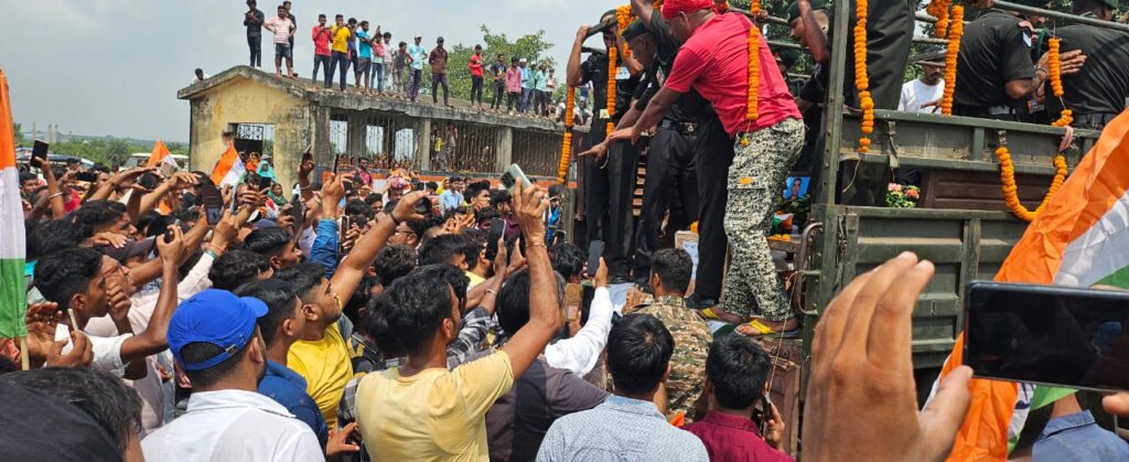 Deoghar// उपायुक्त सह जिला दंडाधिकारी नमन प्रियेश लकड़ा व पुलिस अधीक्षक अजीत पीटर डुंगडुंग ने शहीद अग्निवीर नीरज कुमार चौधरी को दी भावपूर्ण श्रद्धांजलि। वन्दे मातरम“.. “भारत माता की जय” के नारे के साथ अमजनों ने नम आँखों से दी दिवंगत को विदाई.