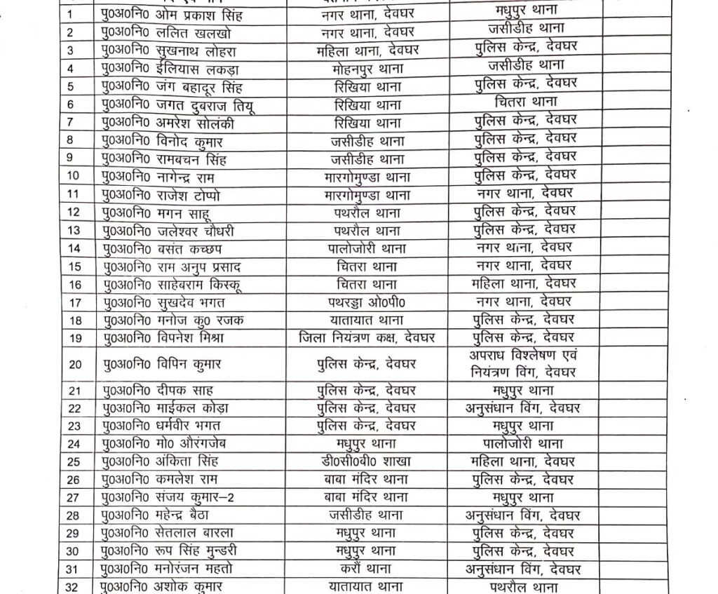 Deoghar// देवघर जिला के कई पुलिस अधिकारयों का हुआ तबादला। पु.नि. रवि ठाकुर को बाबा मंदिर थाना प्रभारी बनाया गया